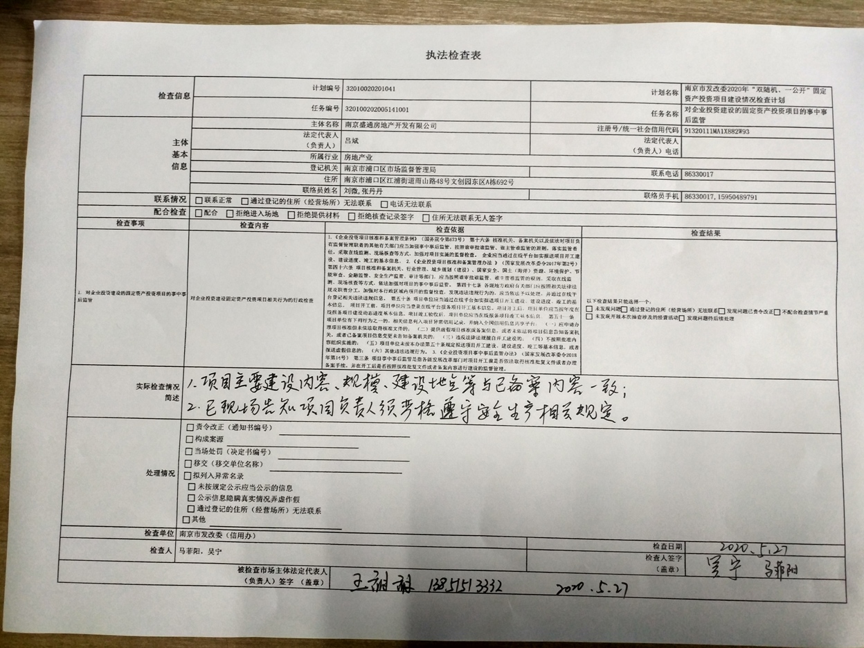 南京盛通房地产开发有限公司项目“双随机、一公开”检查公示