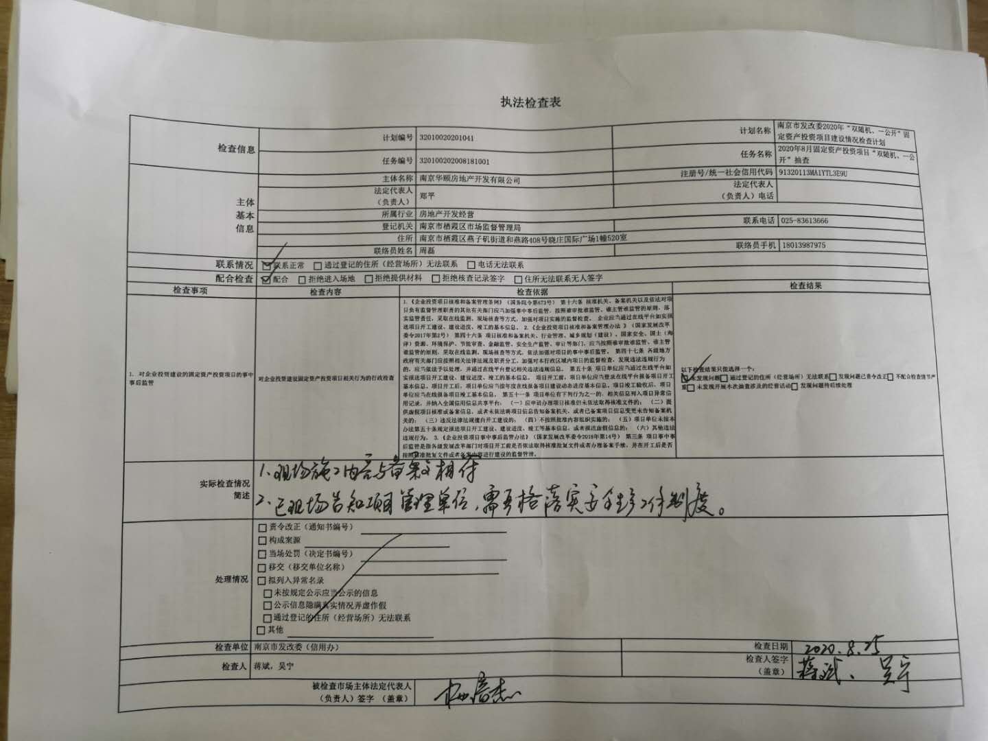 南京市发改委“双随机、一公开”检查项目(南京华颐房地产公司项目)执法检查表公示