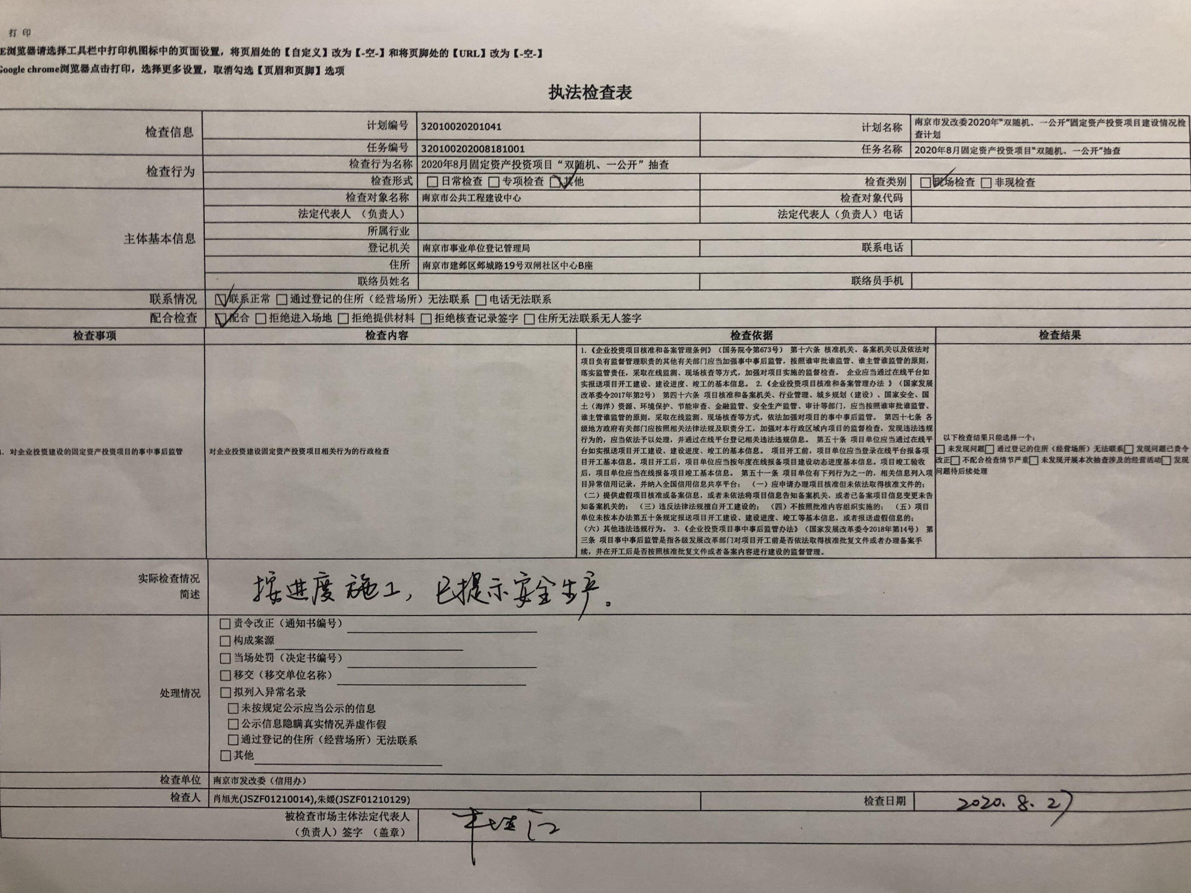 南京市发改委“双随机、一公开”检查项目(南京市公共工程建设中心项目)执法检查表公示