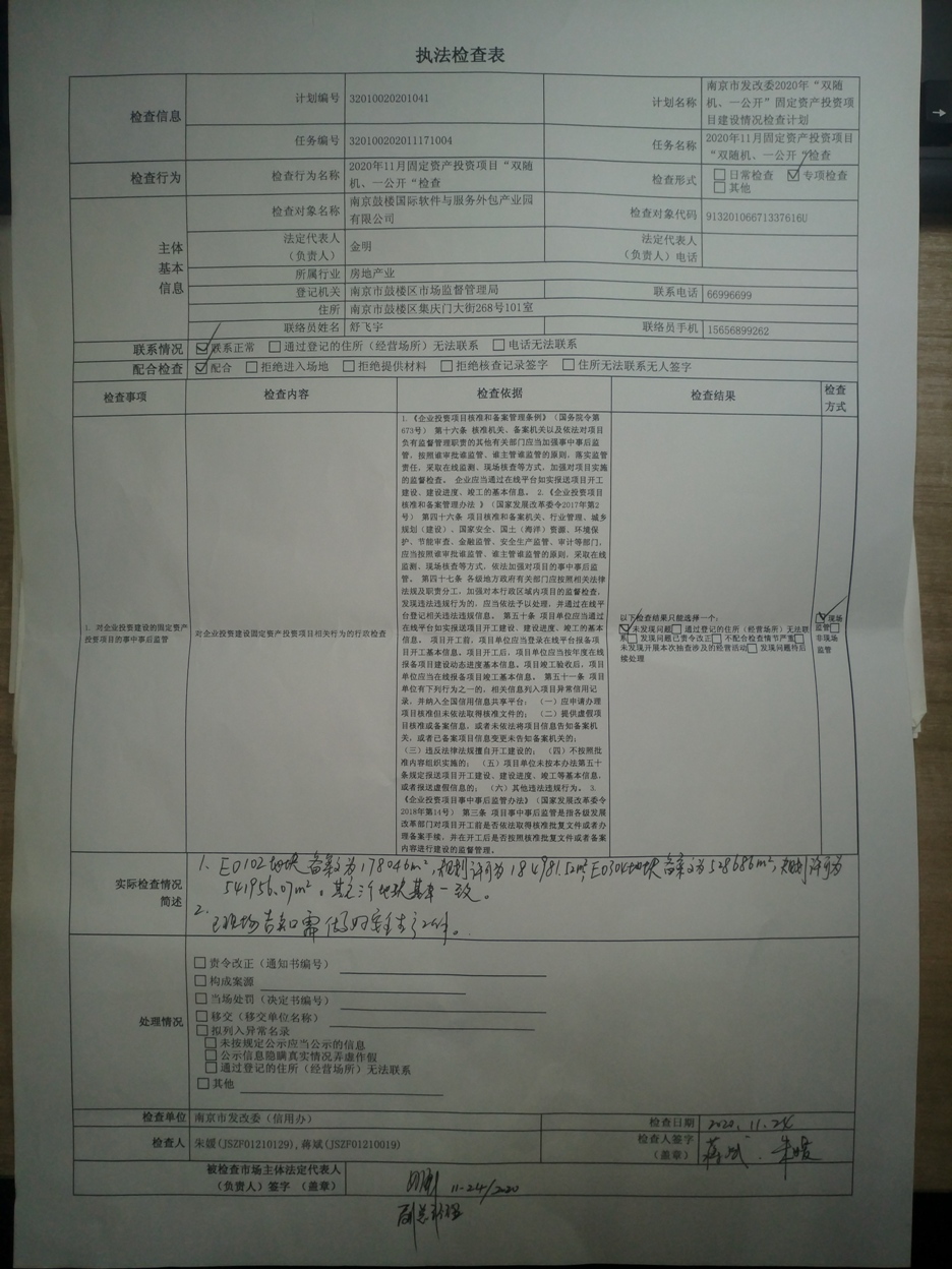 南京市发改委“双随机、一公开”检查项目(南京鼓楼国际软件与服务外包产业园有限公司项目)执法检查表公示