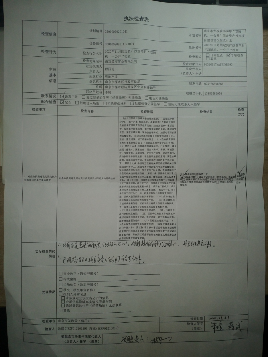 南京市发改委“双随机、一公开”检查项目(南京源宸置业有限公司项目)执法检查表公示