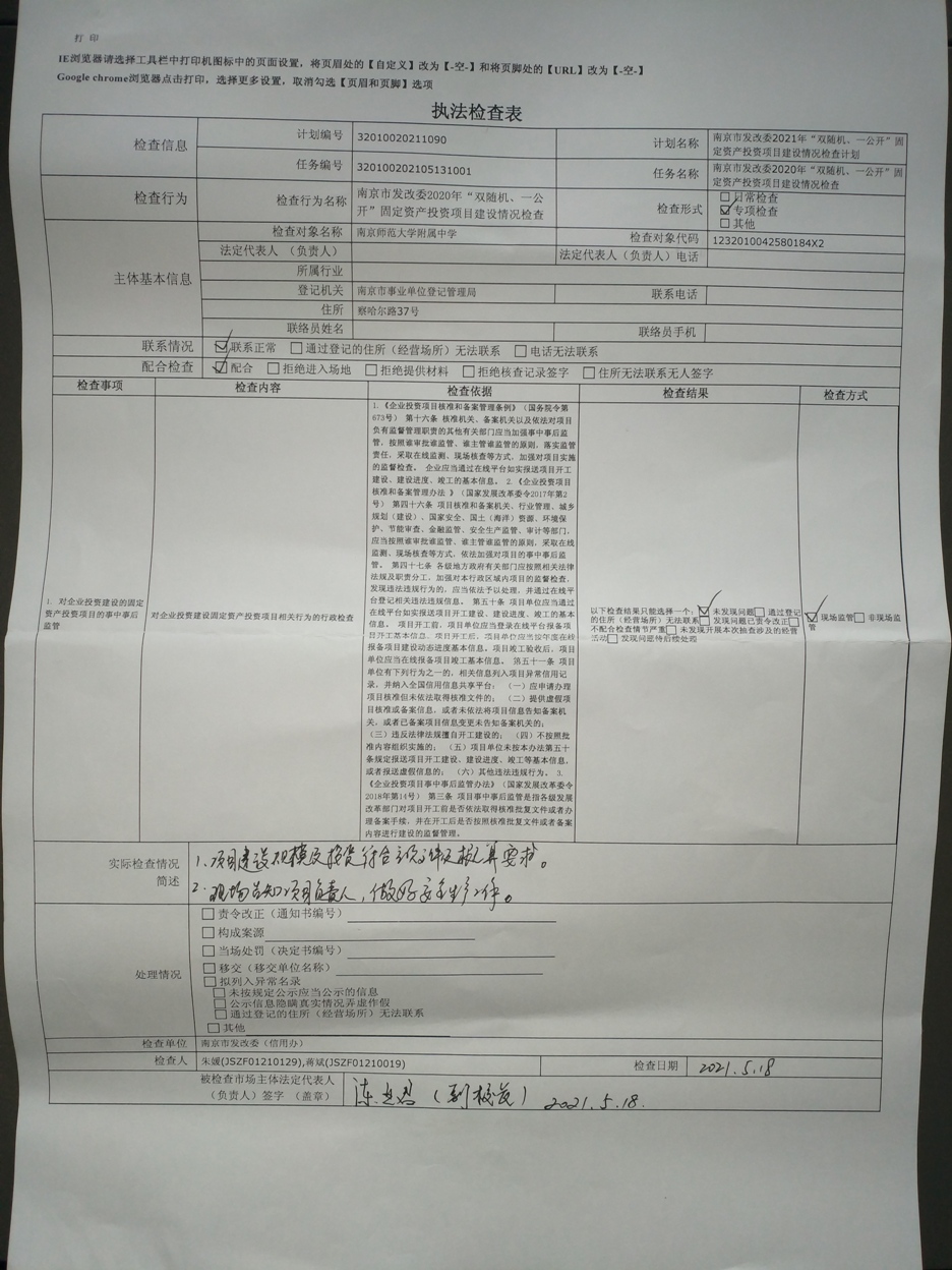 南京市发改委“双随机、一公开”检查项目(南京师范大学附属中学项目)执法检查表公示