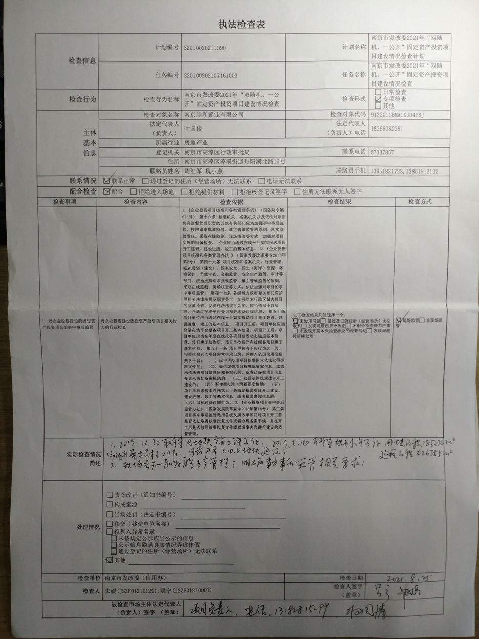 南京市发改委“双随机、一公开”检查项目(南京睦和置业有限公司项目)执法检查表公示