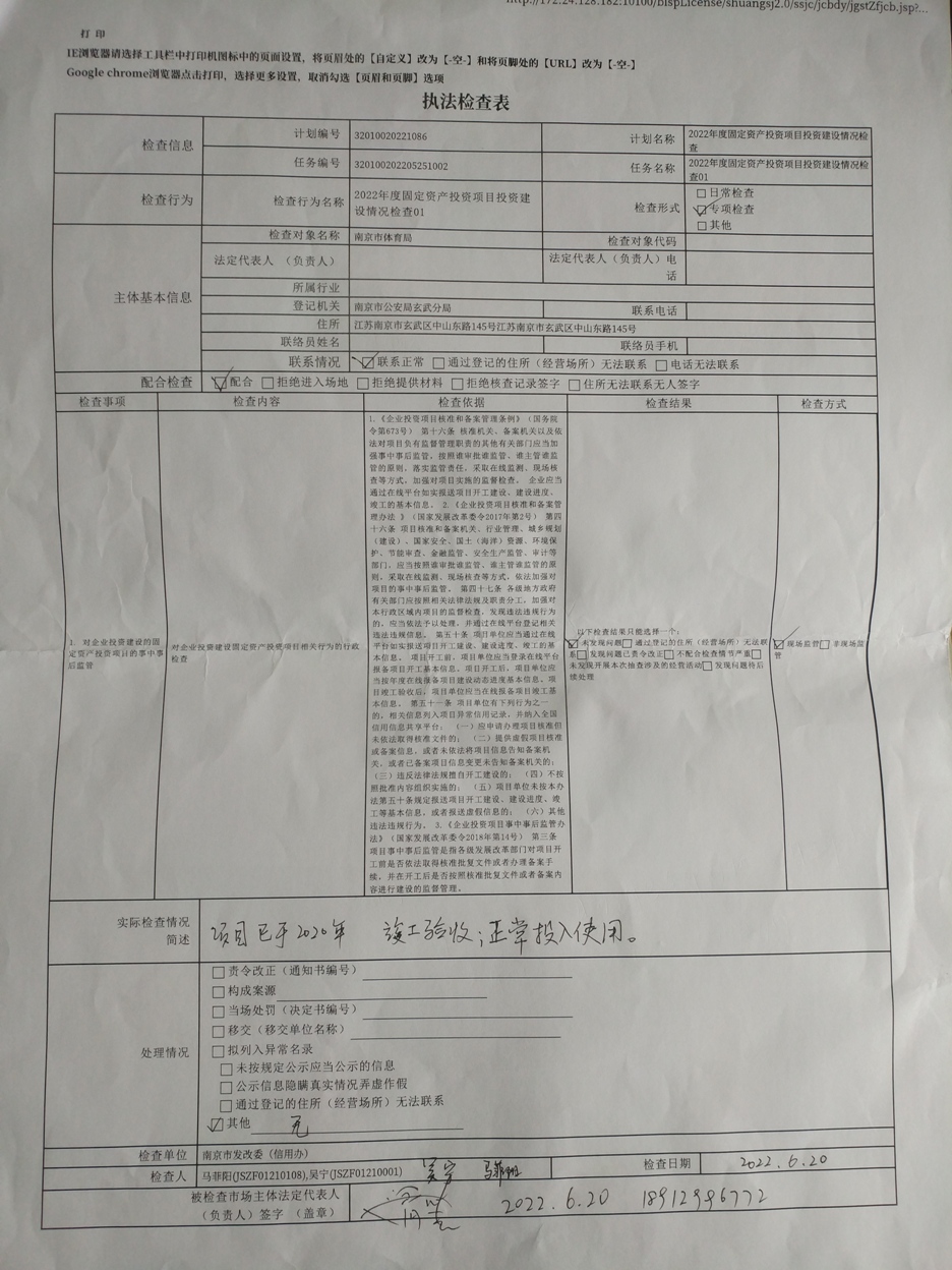 南京市发改委“双随机、一公开”检查项目(南京市体育局项目)执法检查表公示