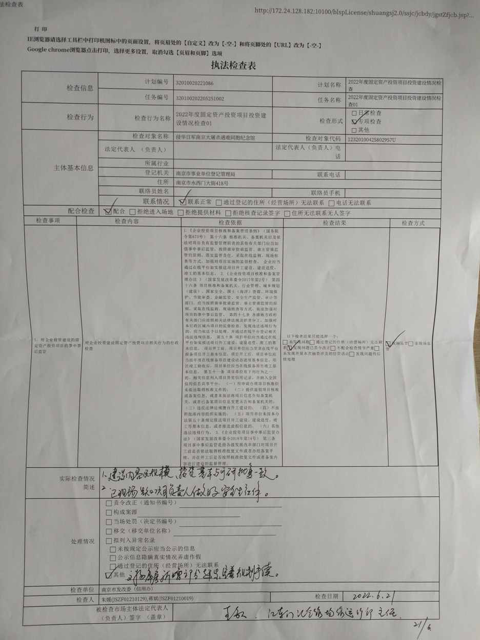 南京市发改委“双随机、一公开”检查项目(侵华日军南京大屠杀遇难同胞纪念馆项目)执法检查表公示