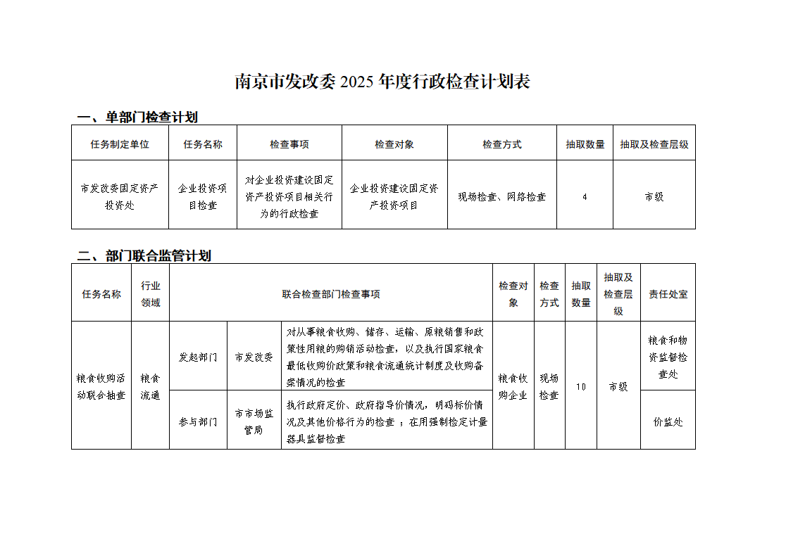 南京市发改委2025年度行政检查计划表